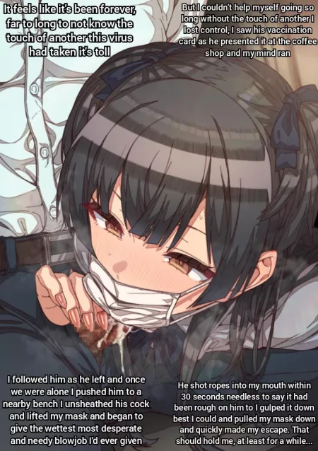 "Social intimacy" [blow job] [mask] [public] [cum] [throatpie] [unbearable] [needy] [vaccine] [dubcon] (artist:erere) (captions: u/sweet_n_soft)